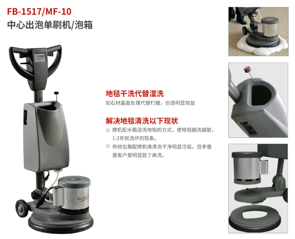 面對地毯迫切的清潔需求,高美清潔設備出品的中心出泡單刷機(FB-1517/MF-10)專為地毯清洗而生。顧名思義,機器使用干泡清洗地毯,擁有快速清洗和干燥的清潔性能,杜絕了水洗地毯的種種弊端。滿足安全清洗的同時,不損傷地毯的訴求,特別適合地毯中期保養(yǎng)使用。