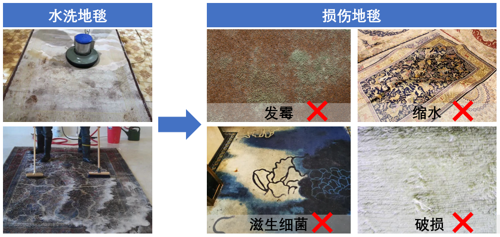 清洗地毯是非常重要的工作,常規(guī)的水洗行為會導致地毯縮水,并且讓污垢沉淀在地毯底部,變得更加難以處理。同時殘留的水份不僅會影響地毯的柔軟度和色澤,還會讓地毯出現(xiàn)結板、發(fā)霉、發(fā)臭、滋生細菌等情況,嚴重損傷地毯。