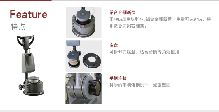 可配40kg加重塊和4kg鋁合金翻新盤(pán),重量可達(dá)97kg,適合石材翻新;也可用于各類(lèi)硬地面清洗,保養(yǎng)和起蠟等工作。適合工礦、大廈、營(yíng)業(yè)廳,尤其保潔公司用于石材日常護(hù)理及特殊處理。 |